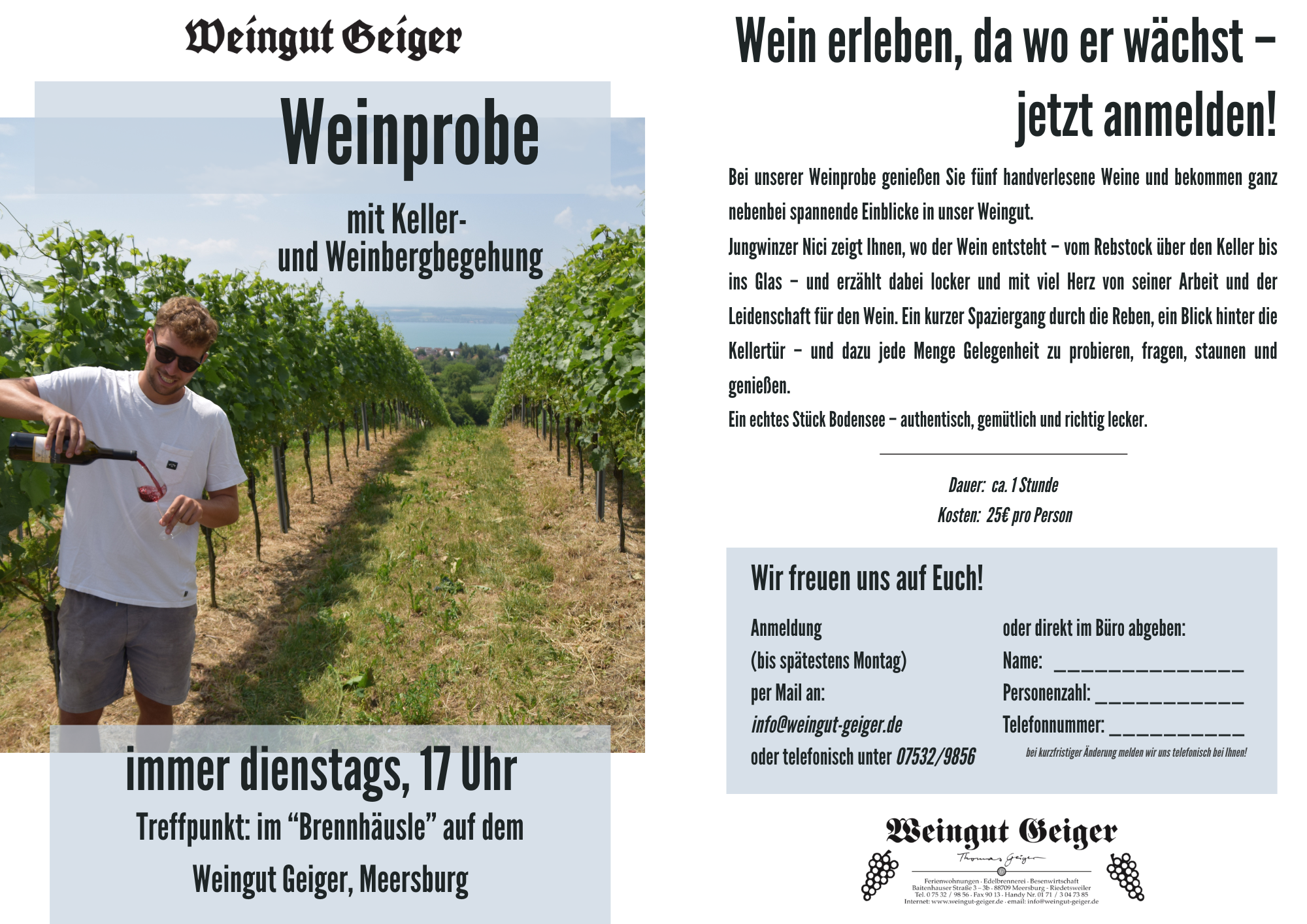 jeden Dienstag um 17 Uhr gibt es bei uns auf dem Weingut die Möglichkeit, nach vorheriger Anmeldung unsere Weine zu verkosten und einen Einblick in unsere Arbeit und Leidenschaft zu erhalten!
