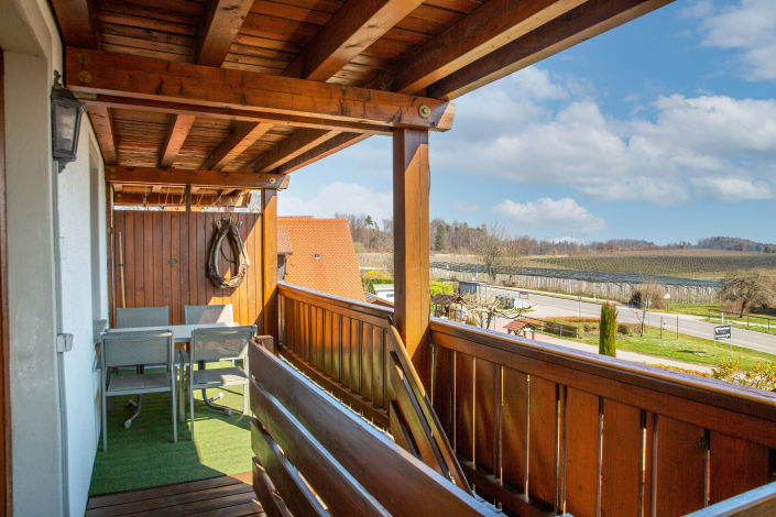Vom Balkon aus genießen Sie die herrliche Sicht auf den Bodensee und lassen die Tage entspannt bei einem Glas Wein ausklingen. Ein behaglicher Rückzugsort, um die Ruhe der Weinberge und die Nähe zur Natur zu genießen.
